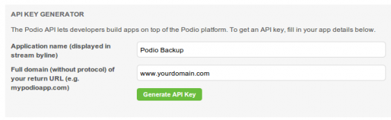 4 - Generate an API key in Podio (go to My Account > Account Settings > API Keys)