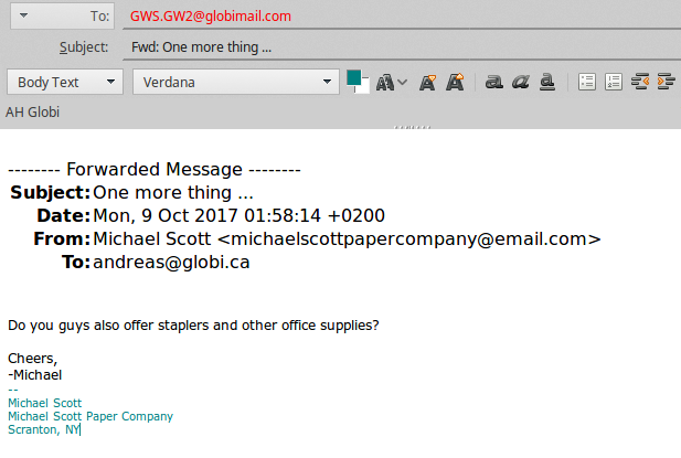 Notice the comment that GlobiMail added to the Item already, complete with a Link to start Composing a New Message